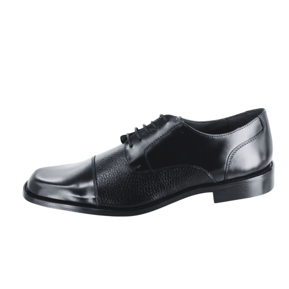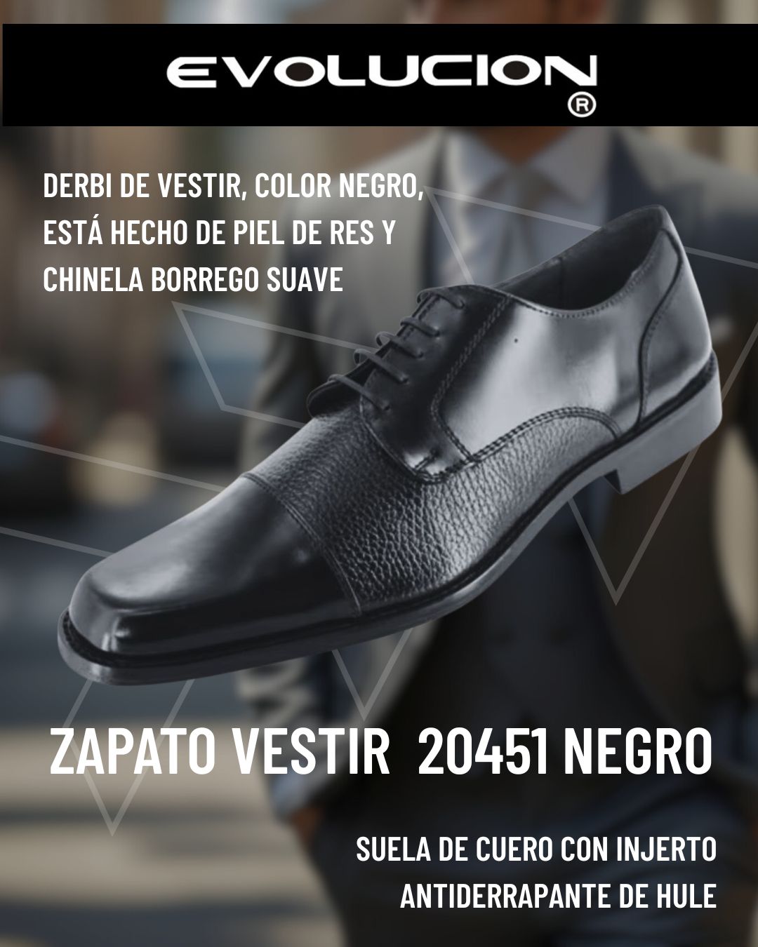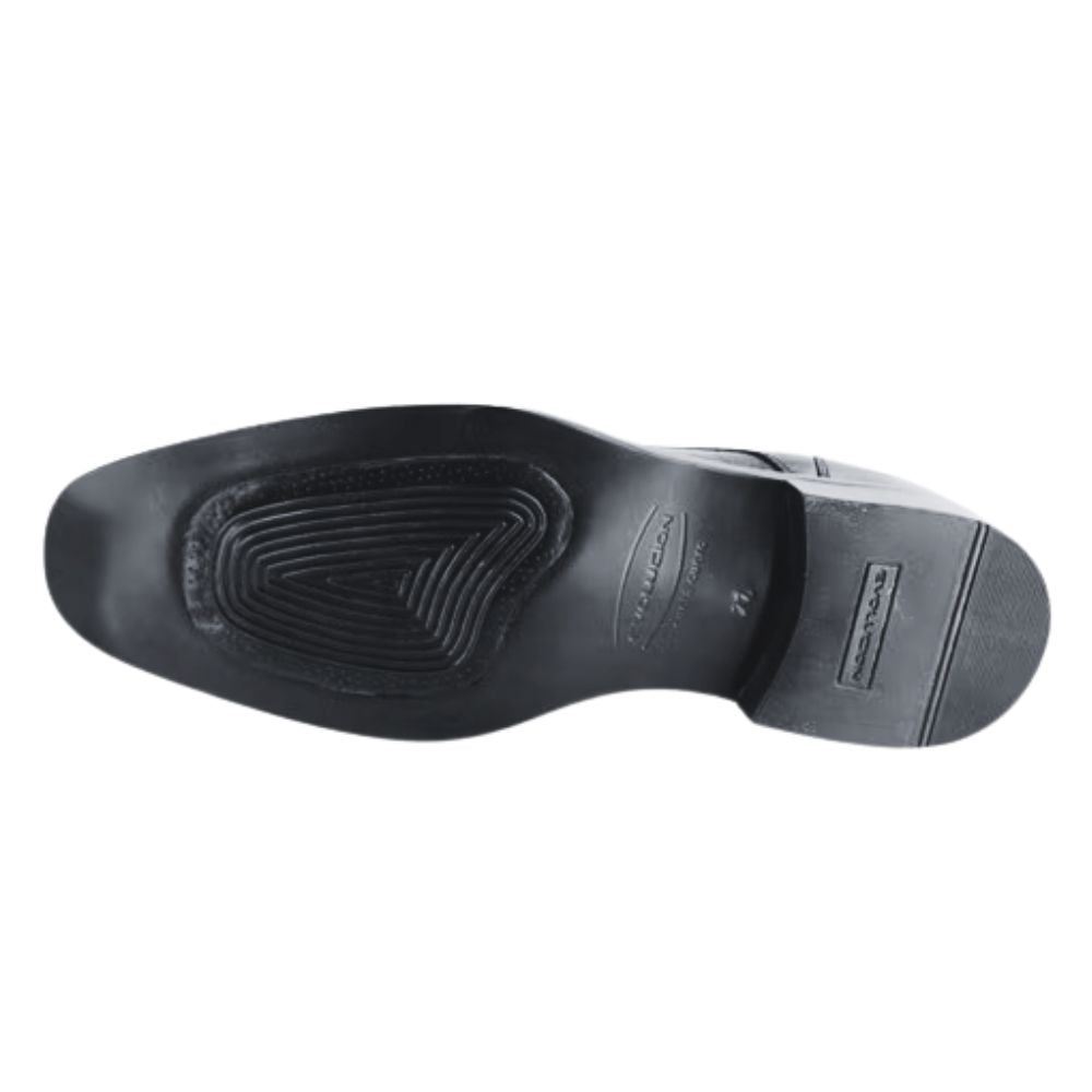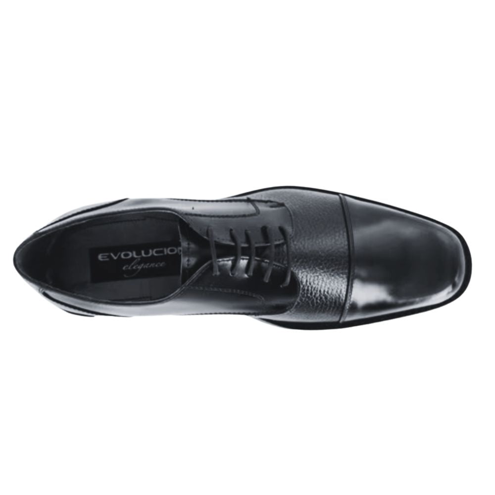 Zapato derby de vestir Evolución para hombre, confeccionado en piel de res negra con chinela de borrego suave y ligera. Suela de cuero con injerto antiderrapante para mayor seguridad y comodidad. Elegancia y estilo para el hombre que gusta vestir bien.